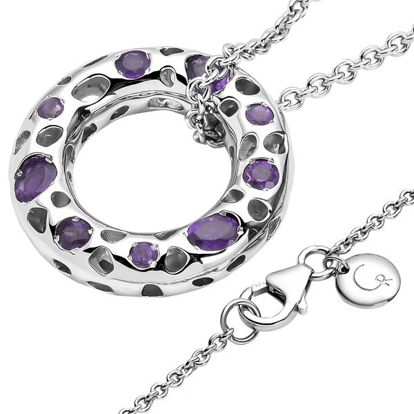 Rachel's popular loop design now features the stunning natural amethyst stone! A versatile donut shape with allegro design looped into a chain - this entire look can become your statement. The contrast of silver and violet pairs excellently with all styles. Wear alone, but best when paired with other layering necklaces.