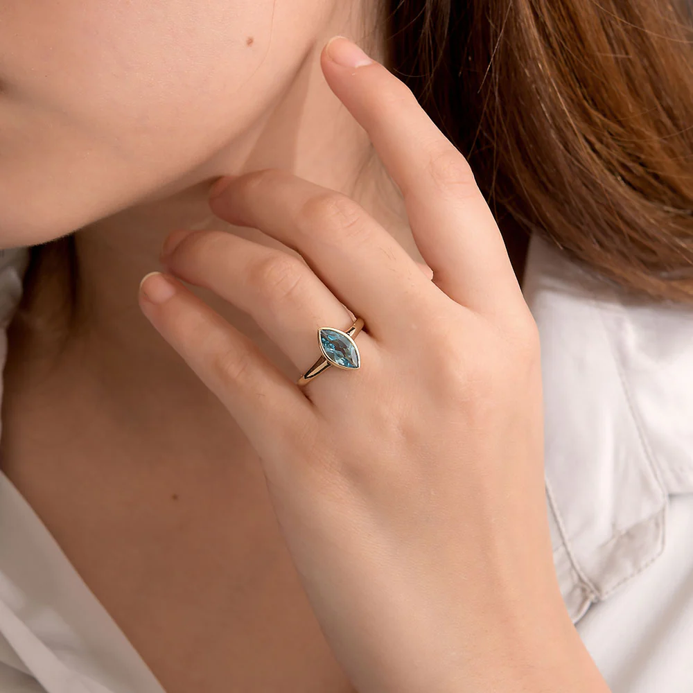 Your favourite Surf Moon ring design is now available in 9K gold! Introducing new marquise-cut solitaire blue topaz ring from the Surf Moon Collection! AAA grade Swiss blue topaz is secured in bezel casing.