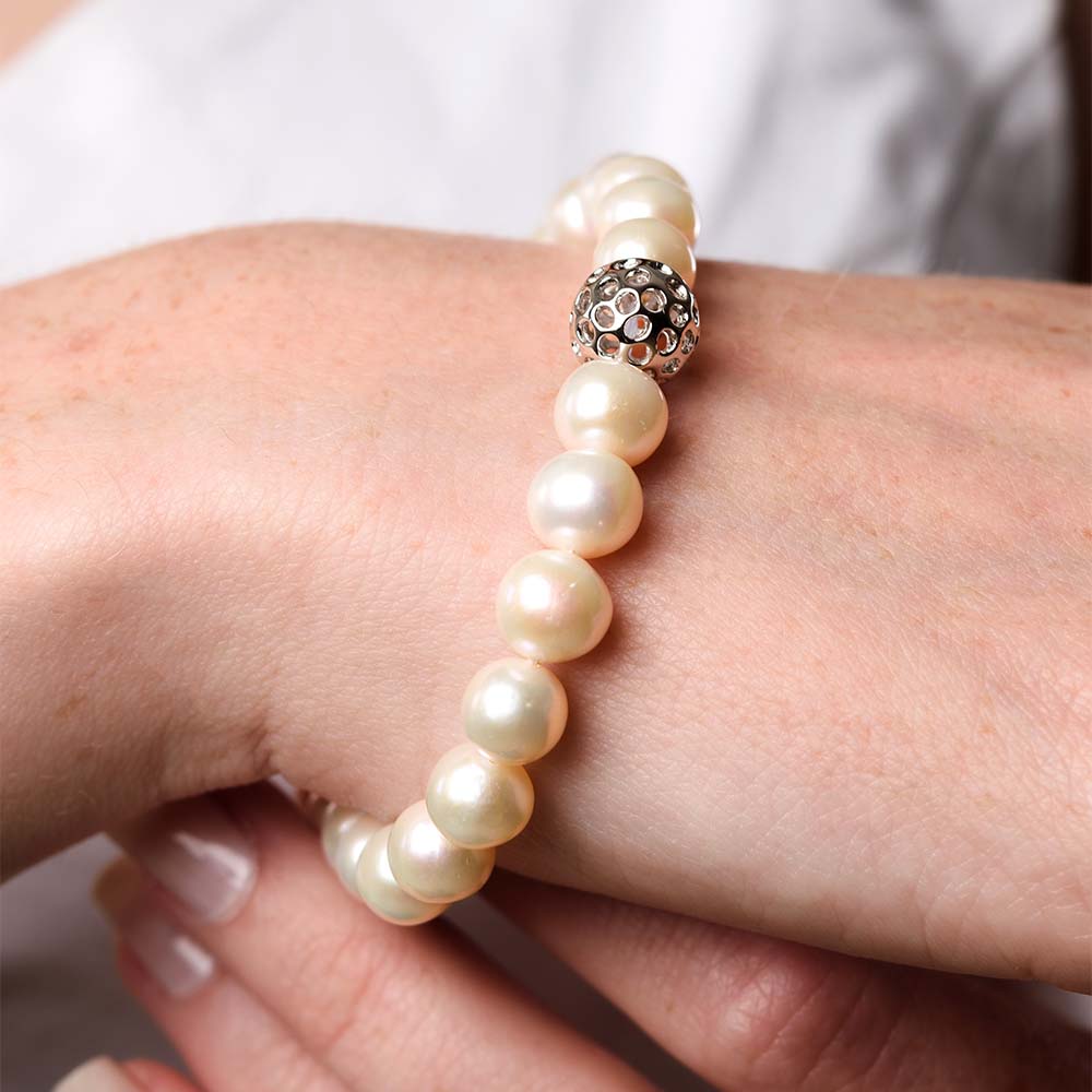 Rachel's signature masterpiece with a beautiful blend of allegro globe charm placed in the middle of classic freshwater white pearls' shine. A riveting design that can be paired with your watches and your other wrist wear.