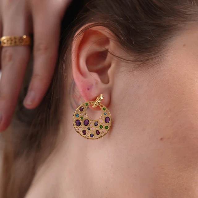 Make your look colourful and in statement style with our limited-edition Lattice Disc Multi-Gem Drop Earrings. Pair it with our trending and classic bestseller Lattice Disc Multi-Gem Pendant with FREE Chain. Studded with AAA grade real gemstones, like amethyst, peridot, garnet, and more!