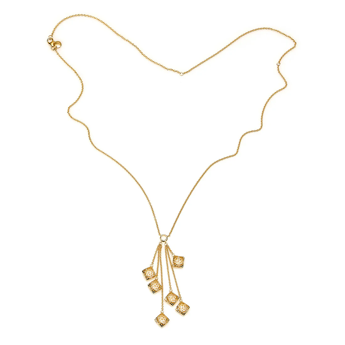 Rachel's signature latticework blended with statement Y necklace silhouette. Multiple pebble shapes dangle at a chain of 30-inches. Perfect as a centre piece of your layering looks, can also be worn alone.