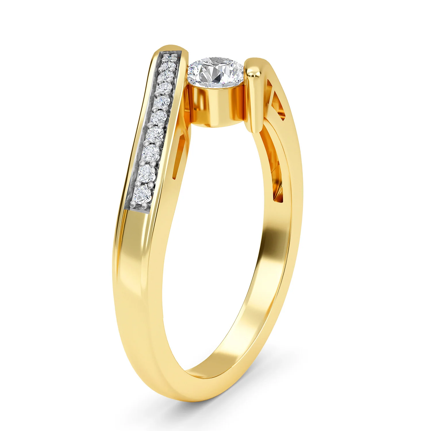 A signature Versa ring that's holding a gorgeous Round brilliant-cut Solitaire diamond in the Centre. One side is studded with a line of SGL certified diamonds of I1 clarity and G-H color. Made in 14 Karat yellow gold, it's a simple statement.